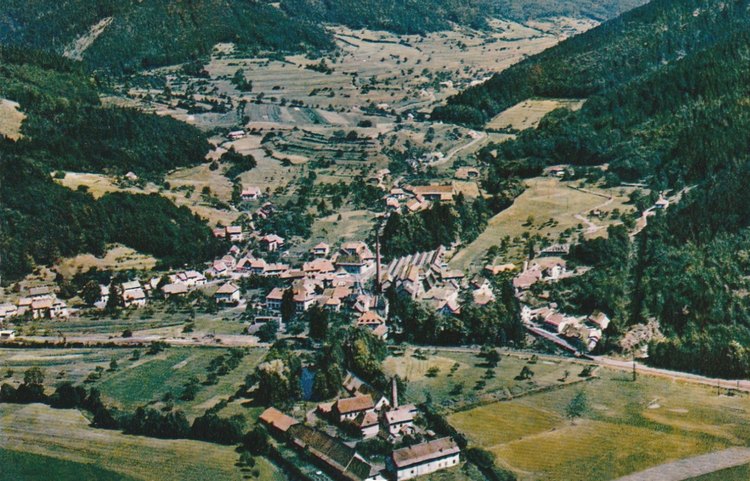 Vue générale vers 1960. On notera l'importance des espaces agricoles encore intensivement exploités par les ouvriers-paysans tant à Oberbruck qu'à Rimbach (à l'arrière-plan). |