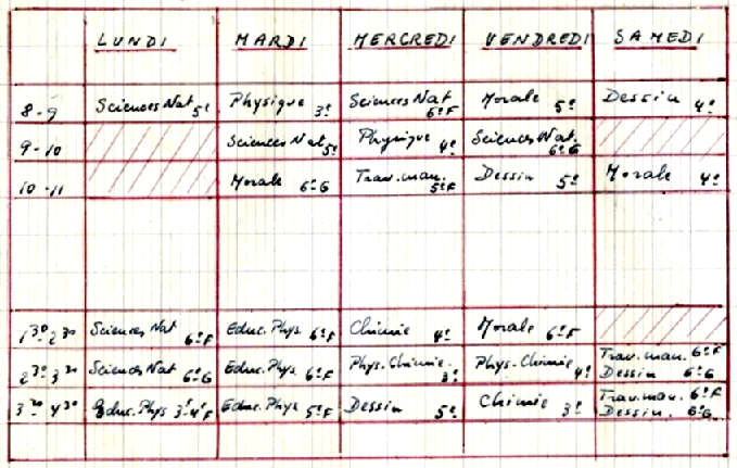 Emploi du temps d'un professeur de sciences durant l'année scolaire 1958-1959. |