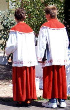 | Ci-dessous, servants de messe dont la tenue est semblable à la nôtre : une soutanelle rouge sur laquelle nous enfilions un surplis blanc brodé, et, par-dessus les épaules, un camail rouge. | |||||