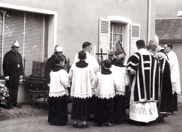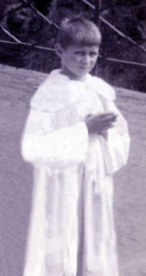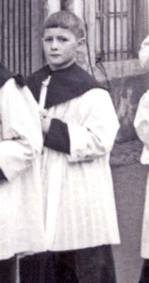 Mon service d’enfant de chœur me mettait en contact étroit avec les joies et les peines de la communauté villageoise. J’ai surtout été marqué par les enterrements ; à l’époque, on ne les imaginait pas sans servants de messe. S’ils se déroulaient pendant les heures de classe, nous quittions l’école pour participer au service funèbre. Vêtus de noir et de blanc, nous accompagnions le curé pour la levée du corps devant la maison du défunt où le décorum du deuil et les pleurs des familles me plongeaient dans l’ambiance mortuaire. Et, lors de la messe, les chants traditionnels des enterrements : "Requiem", "Dies irae", "Libera", "De Profundis" renforçaient encore ce sentiment de la mort présente qui s’intensifiait pendant le convoi vers le cimetière. |