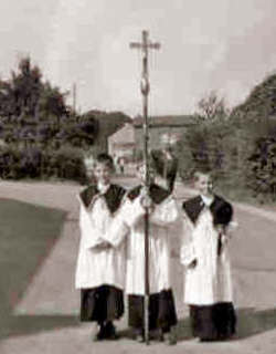 servants de messe, échelonnés à quelques pas les uns des autres,