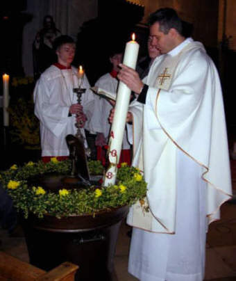 Pendant la bénédiction de l'eau du baptême. |