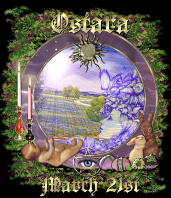 Représentation de la déesse Eostre. Parmi ses attributs, le lièvre et les oeufs, symboles de fertilité. |