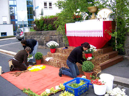 La Fête-Dieu, appelée en alsacien "Liawahergottstàg" * était célébrée un dimanche de mai ou de juin, soixante jours après Pâques. C’était la manifestation religieuse la plus spectaculaire de l’année ; ses préparatifs duraient plusieurs jours. Dès le milieu de la semaine, les enfants étaient sur la brèche pour remplir des pleins paniers de fleurs des champs. Ils n’en cueillaient que les têtes, qu’ils arrachaient en peignant les herbes avec les doigts écartés de la main. Après l’école, des groupes issus de chaque quartier se rendaient dans les recoins humides de la forêt pour se fournir en plaques de mousse qu’ils prélevaient délicatement sur les pierres. Le vendredi soir, les hommes se retrouvaient pour dresser les reposoirs où la procession ferait halte. A l’aide de tréteaux, de chevrons et de planches tenus en réserve d’une année à l’autre, ils édifiaient un autel provisoire à plusieurs gradins que de jeunes sapins, disposés sur les côtés et à l’arrière, enserraient de verdure. Le samedi, les femmes camouflaient le bois brut à l’aide de tapis et de nappes. Une abondance de fleurs s’ajoutait à la mousse ramassée par les enfants pour créer un décor champêtre. Enfin, elles y déposeraient en dernière minute statues, icônes, chandeliers, cierges et tout objet de piété que le voisinage pouvait fournir.