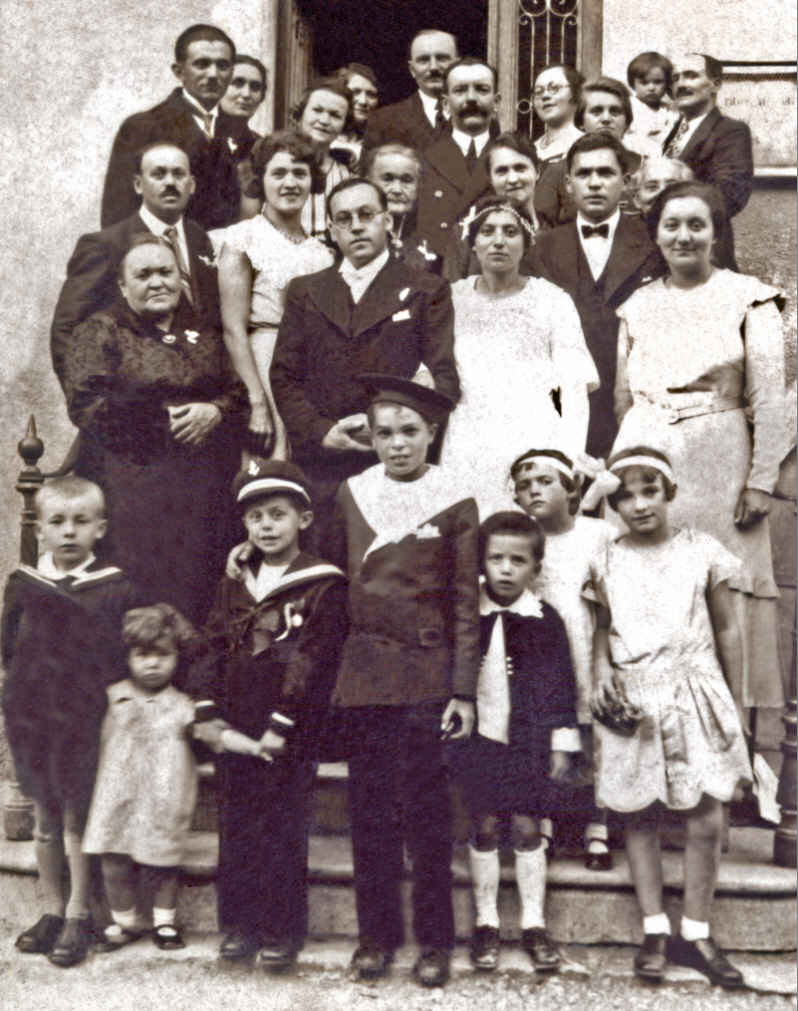 Photo de mariage du couple Georges Bassenne et Anne Bouhélier, le 8 septembre 1934 à Clerval. C'est la seule photo connue où apparaissent tous les frères et sœurs de Paul Bassenne et Aline Bouhélier. (Pour l'identification des personnes, voir sous la photo.) | |