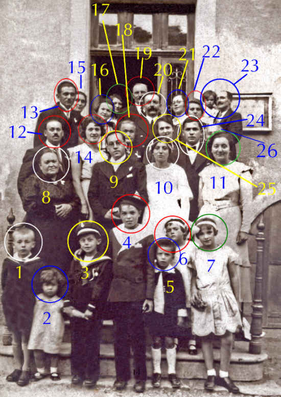 12 et 15 : Paul et Aline. Génération précédente : 8 : Marie Bergerot-Bassenne, mère de Paul et Georges. 18 : Valentine Bergerot, sœur de Marie, 26 : Thérésia Ponçot, tante d'Aline et d'Anne, dite "La Tintie". Le frère et les sœurs d'Aline et Anne : 11 : Thérésia Bouhélier, 13 : Louis Bouhélier, 17 : Marie Bouhélier-Cuenot, 22 : Adèle Bouhélier-Emonin. Les sœurs de Paul et Georges : 16 : Cécile Bassenne-Corneille, 21 : Madeleine Bassenne-Mesnier, 25 : Valentine Bassenne-Busson. Les conjoints : 19 : Delphin Cuenot, 20 : Eugène Emonin, beaux-frères d'Aline et d'Anne, 23 : Georges Corneille, beau-frère de Paul et Georges.