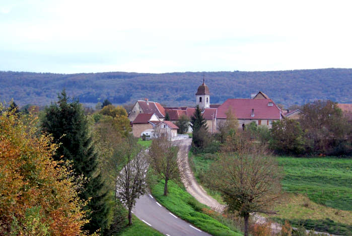Depuis 2007, le village est dominé par des éoliennes érigées sur la crête du Lomont. (Photo actualisée : octobre 2021.) | |