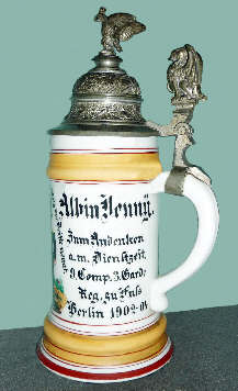 La chope souvenir. Traduction de l'inscription en allemand : Albin Jenny. En souvenir de mon service militaire à la 9ème Compagnie du 3ème Régiment de la Garde à pied. Berlin 1902-1904. |