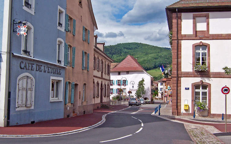 L'auberge "Zur Traube" ci-dessus était aussi appelée "Restauration zum Velo-Chari" car son propriétaire, Charles Trommenschlager, était également réparateur de bicyclettes et président du Vélo Club de Masevaux à l'orée du XXe siècle. |