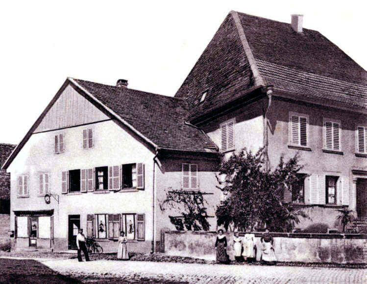 Rue Meyenberg vers 1900 : "Wirtschaft zu den zwei Schlüsseln, Spezerei und Bäckerei". Propriétaire : E.Richert. |