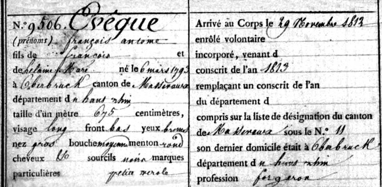 Le couple Nicolas François Lévêque et Hélène Maré a dix enfants. Le second fils, François Antoine, né en 1793, connaît une jeunesse dramatique. En 1812, il est appelé dans l'armée napoléonienne en tant que grenadier au 61e Régiment de ligne. Il y sert jusqu'à Waterloo où il est grièvement blessé. Il reste pour mort sur le champ de bataille ; pourtant il survit. Fait prisonnier par les Prussiens, il parvient à s'évader et revient jusqu'en Alsace à l'aventure, mendiant gîte et pitance sur les chemins qui le ramènent dans son village natal.