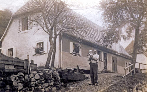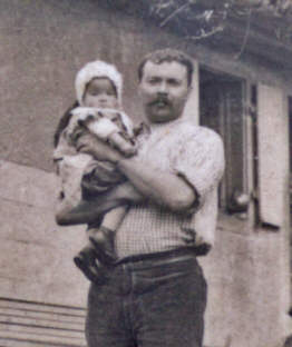 | Ci-dessus, Robert Lévêque tenant dans ses bras sa fille Anne en 1912, devant la maison familiale à Oberbruck. | ||||||