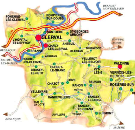 Clerval et ses environs proches : les communes citées dans ces pages sont repérées par une pastille rouge. |