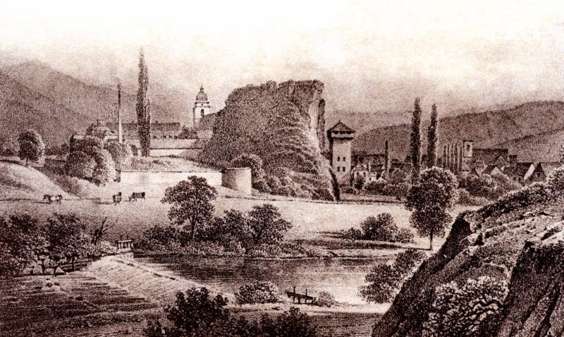 Masevaux et le Ringelstein au milieu du XIXe siècle, d'après une lithographie de Schifferdecker.