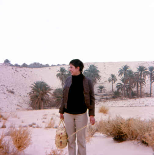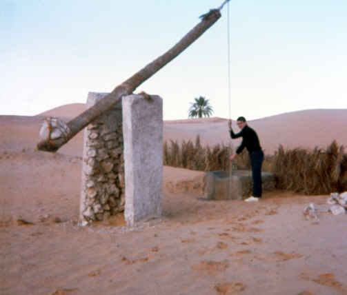 Près d'El Oued, devant les palmeraies plantées au fond d'un entonnoir. Les agriculteurs doivent perpétuellement remonter le sable du fond des cuvettes pour éviter l'ensablement définitif de leurs arbres |